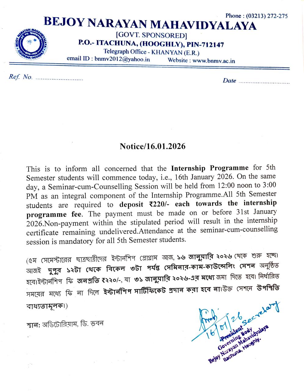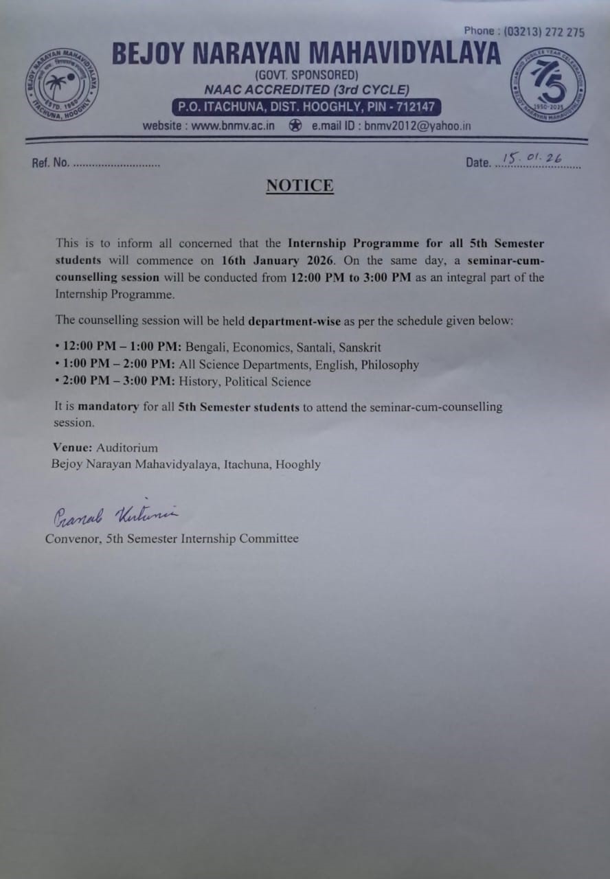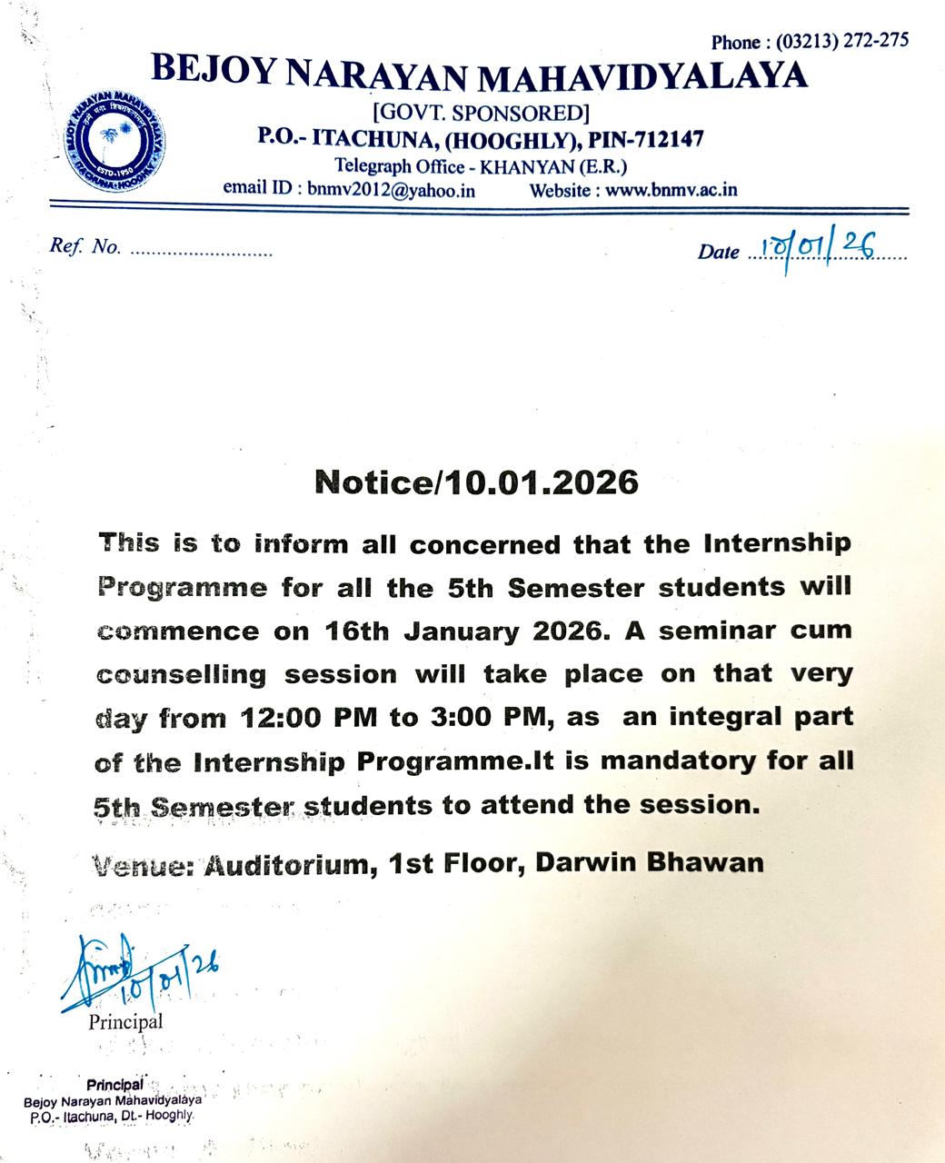 Notice for Quotation regarding Internship Program for all the Vth Sem Students